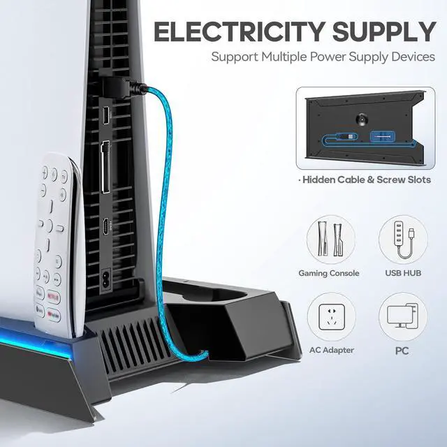 [Fit PS5/Slim/Pro Console] PS5 cooling station is meticulously designed to ensure a perfect fit for PS5/Slim/Pro Console, covering both the Disc & Digital versions. We've thoughtfully included screws to securely fasten the console, providing reliable protection against scratches and ensuring it stays firmly in place on this ps5 vertical stand.