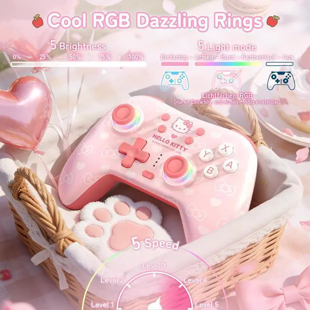 Original design/Cool RGB lighting/Hall effect joysticks/1000mAh upgrated battery/Support various platforms and so on. Our unique switch controller will be a great gift for yourself, girlfriend, children and friends.