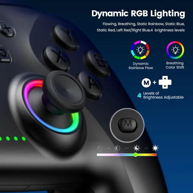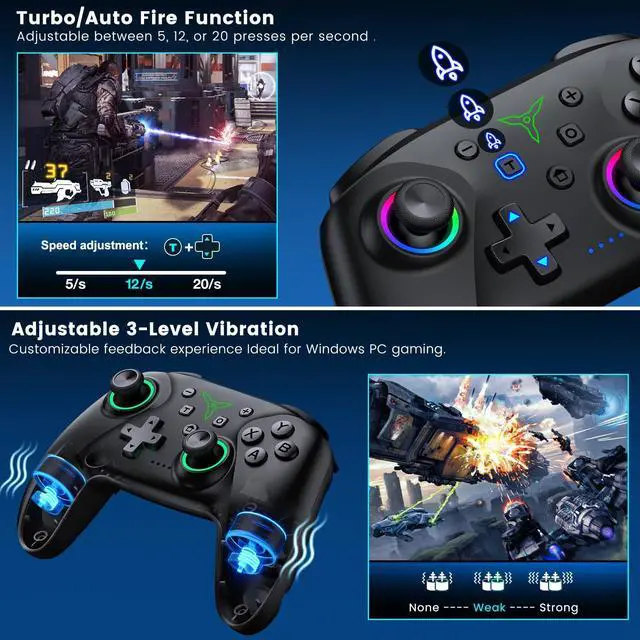Immersive Feedback ExperienceWireless PC Gaming Controller with dual vibration motors with 3 intensity levels (adjust via L+R+ZL+ZR combo). Switch-exclusive motion controls. Note: Vibration disabled on mobile platforms; gyro works only with Nintendo systems.