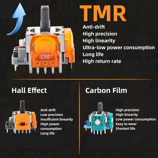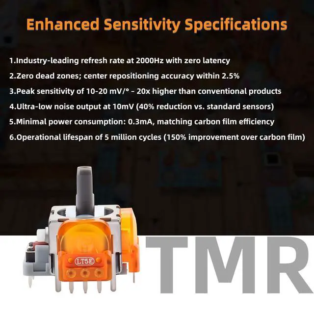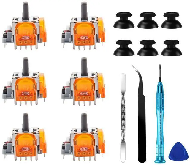 The 6 Pack Joysticks Replacement kit offers a comprehensive set of tools for PS5 controller repairs, including 6 TMR Joysticks, 6 Thumb Sticks, 1 Tweezers, 1 Triangular tool, 1 Pry Bar, and 1 Crossed Screwdriver.