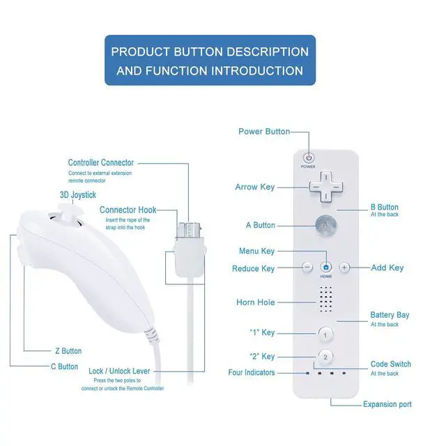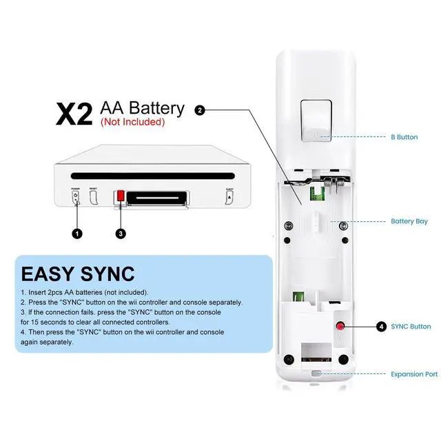 1. Insert 2pcs AA batteries. 2.Press the "SYNC" button on the wii controller and console separately. 3. If the connection fails, press the "SYNC" button on the console for 15 seconds to clear all connected controllers. 4. Then Repeat step 2