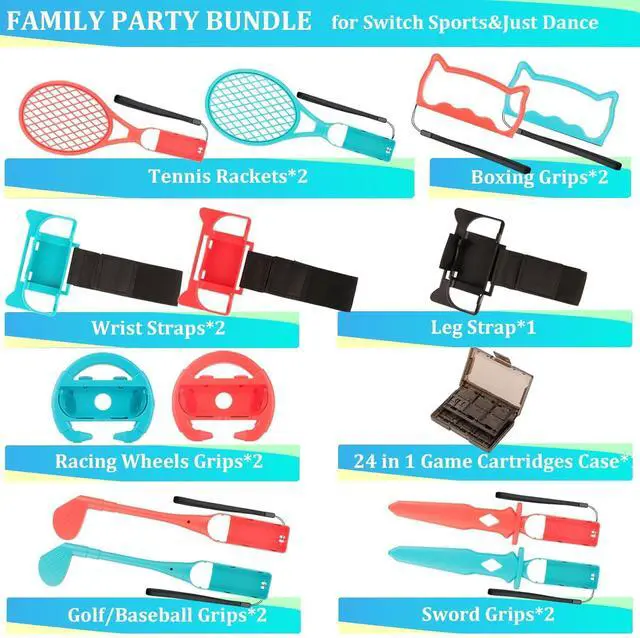 Switch Accessories Sports 14-Piece Set: Includes 2 racing wheel grips, 2 tennis rackets, 2 boxing grips, 2 golf grips, 2 wrist straps, 2 sword grips, 1 leg strap, and a 24-in-1 game cartridge case
