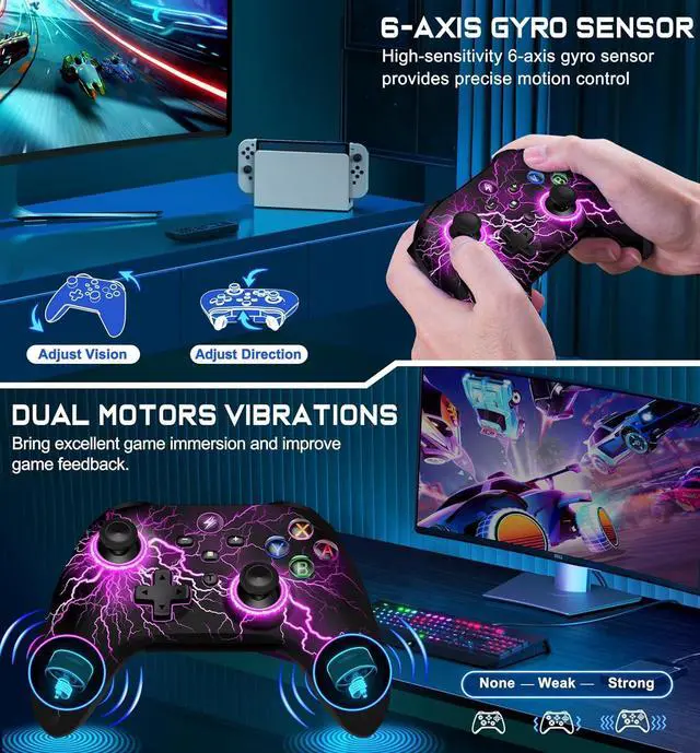 Built-in 6-axis gyro sensors provide stability and direction by sensing motion caused by vibrations, that help you make a quick response in your switch games. Support One Key Wake Up your switch console, Press " Y + HOME" button for first connection. Next time just simply press " HOME" key to wake up and re-connect your device