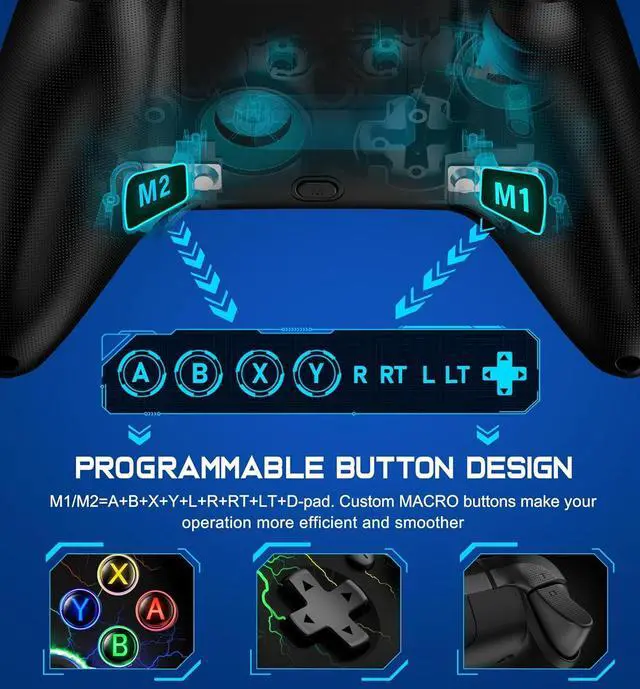 CUSTOM BUTTONS & ADJUSTABLE TURBO FOR ALL MUTIL-PLATFORMM1/M2 back buttons can map basic function keys of A/B/X/Y/L/ZL/R/ZR/L3/R3/D-pad keys to reach 1-16 combine function keys, to meet all your need in different game to improve game experience. Two modes of