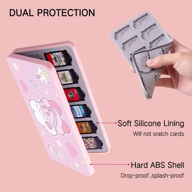 Full Protection The outer hard shell is made of high-quality ABS material, which is waterproof, dustproof, shockproof, scratch-proof, sturdy and durable, effectively protecting the Switch game card from impact and falling. The interior cushion protector is made of soft silicon lining material, precise card position, ensure the Switch game cards stay at place without slipping.
