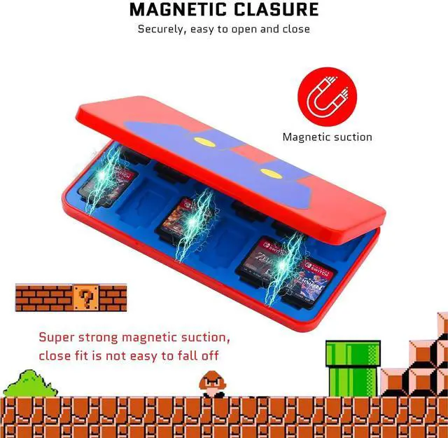 Magnetic Closure Design The magnetic cover design makes the switch case holder more convenient and safe. And the magnetic closure prevents the game case storage from being opened when falling and causing the game card to be damaged. At the same time, you can easily open and access the game cassette. The slot position of the card allows your fingers to easily take them out, which is ergonomic.