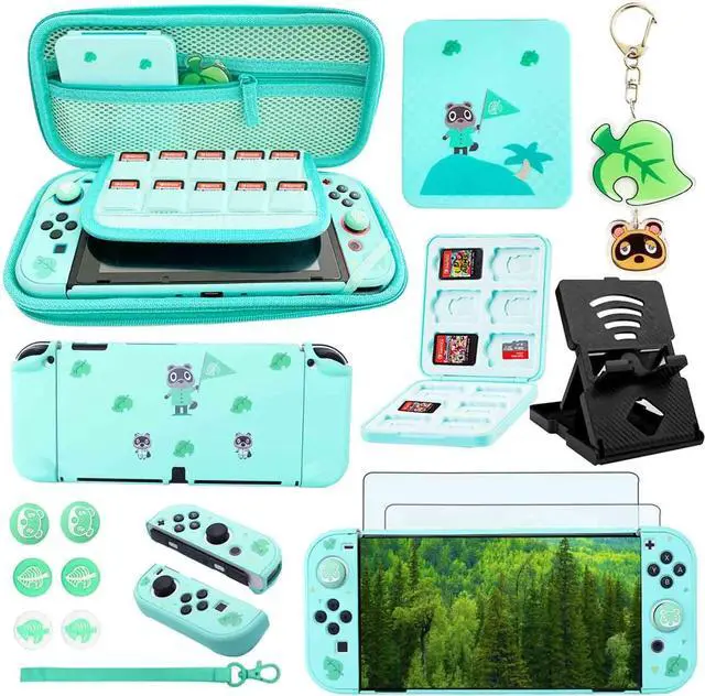 12 IN 1 HIGH QUALITY ANIMAL CROSSING BUNDLE ACCESSORIES KIT FOR NINTENDO SWITCH OLED - 1x Carrying Case (for nintendo switch Oled accessories & console ), 1x Comfort Protective Cover Case, 2x Tempered Glass Screen Protector, 1x Foldable and Adjustable Play Stand, 1x Game Card Case, 6x Thumb caps. The high quality animal crossing assesories kit for nintendo switch Oled Model 2021 saves your money and time on searching varieties accessories