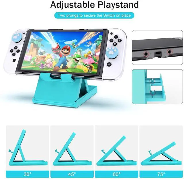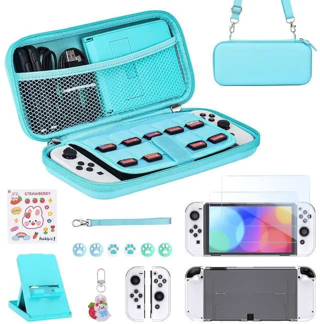Switch OLED Accessories Kit: 1 x Switch Oled carrying case, 2 x tempered glass screen protectors, 1 x crystal case for Switch oled console, 2 x protective case covers for J-Con, 1 x Adjustable Switch Stand, 6 x thumb caps, 1 x sticker, 1 x pendant, 1 x shoulder strap, 1 x wrist strap