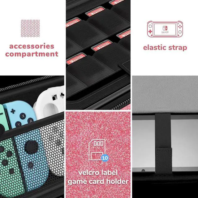 Nintendo Switch Storage Case--Glitter Switch Carrying Case offers a basic storage room to hold up cables, up to 10 game cards, consoles, and other Nintendo Switch accessories. The built-in elastic strap and velcro tap can fix your Switch console firmly.
