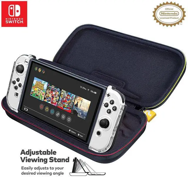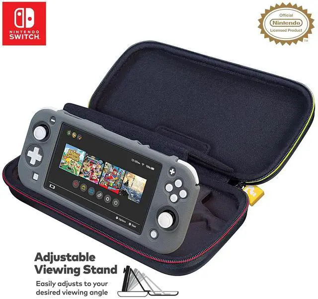 Recessed bottom holds Nintendo Switch with or without licensed Joy-Con Action Grips or Nintendo Switch Lite system with or without protective glove