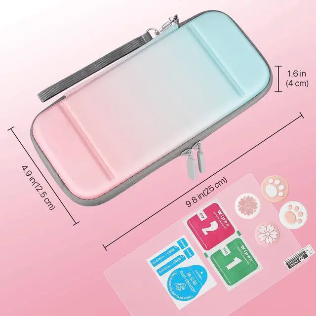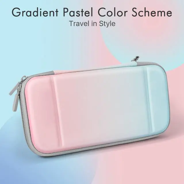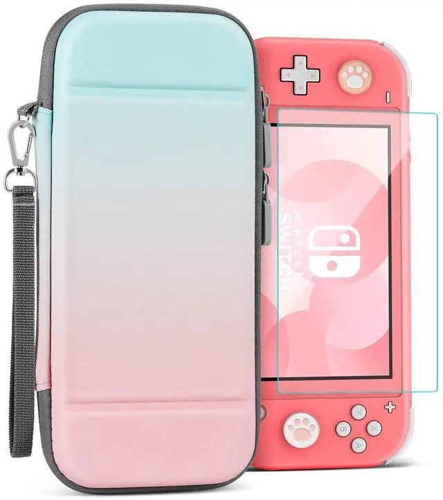 4-In-1 Storage Kit Carry Case For Nintendo Switch Lite Includes - 1x Hard-shell Carrying Case, 1x Temper Glass Screen Protector, 4x Thumb Grip Caps, 1x Wristlet Strap. Fashion / Cute gradient pastel color Switch case design makes your device fashionable, colorful, beautiful, and full of vitality