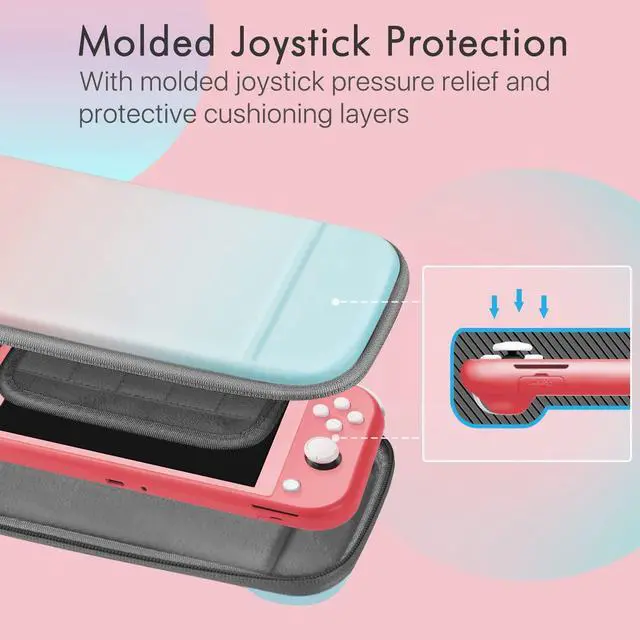 Raised EVA Hard Shell For Joystick Pressure Prevention - Customized compartments with molded joystick pressure relief design that fits the Nintendo Switch Lite Console perfectly. By using the elastic strap to ensure your Switch stays stable and does not bounce around inside the carrying case
