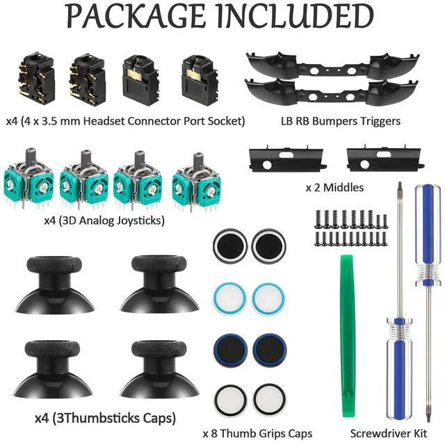 Package include: 4 pieces 3D analog joysticks, 4 pieces thumbsticks caps, 2 pieces LB RB bumpers triggers, 2 pieces middles, 4 pieces 3.5 mm headset connector port socket, 4 pieces red transparent replacement button XYAB buttons, 8 pieces thumb grips caps, 1 piece T6 screwdriver, 1 piece T8 screwdriver, 1 piece double-headed crowbar and several controller T6, T8 screws, sufficient quantity can meet your daily use and replacement