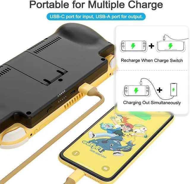 Dual-Port Charging Convenience: Switch Lite battery pack features a USB-C input port for recharging the battery case. USB-A output port to charge other devices like phones, tablets, or other devices. The Switch Lite and external devices can charge simultaneously.
