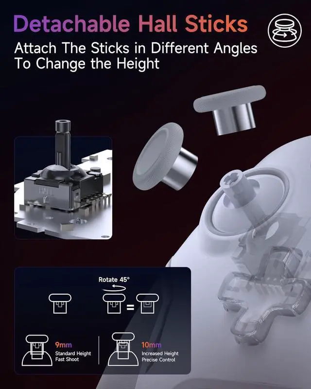 Swappable Hall Joysticks Magnetic, drift-free thumbsticks can be swapped out in different heights and angles, letting you customize comfort, accuracy, and durability to fit your playstyle.