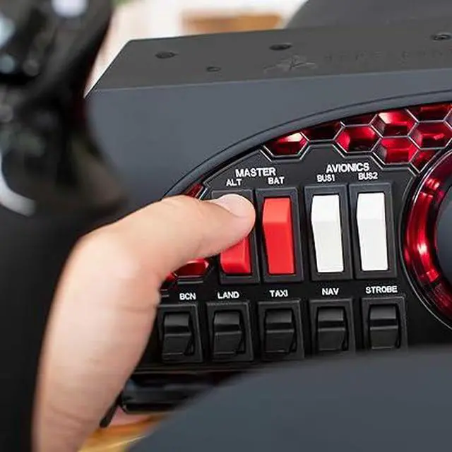 Integrated Switch Panel: The switch panel features main, alternator, avionics, light switches, and a 5-position ignition switch. This flight yoke also ensures good operability during night flights with red LED backlighting.