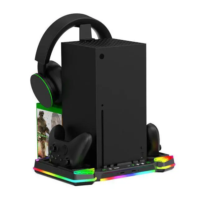 This product is suitable for cooling the XBX console and charging the original controller.2. Equipped with 4 low-noise cooling fans, it has excellent cooling performance and low noise.3. Equipped with 1 touch button for the fan speedadjustment and 1 touch button for the lighting mode.4. Equipped with a headphone holder for easy storage of headphones.5. It has two storage expansion card slots, facilitating the storage of expansion cards.6. Equipped with a game disc holder, which can hold 6 game discs.7. Equipped with RGB vibrant lighting effects, featuring a total of 11 different lighting effects.8. Compatible with the original protective case of XBX.