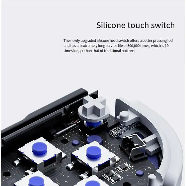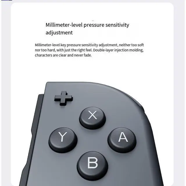 • Connection method: Bluetooth/WirelessApplicable platforms: SWITCH, SWITCH OLED,SWITCH LITE. Trigger type: Standard triggerRocker type: Ordinary carbon film rockerVibration adjustment: (Five levels of free adjustment available)Button layout: Switch layout (Up X, Down B, Left Y, Right A)Button type: Touch switchDistance range used: <8MBack key expansion: NoneSix-axis gyroscope (motion sensing): YesRGB lighting effect: NoneMotor type: Flat, ordinary small motor