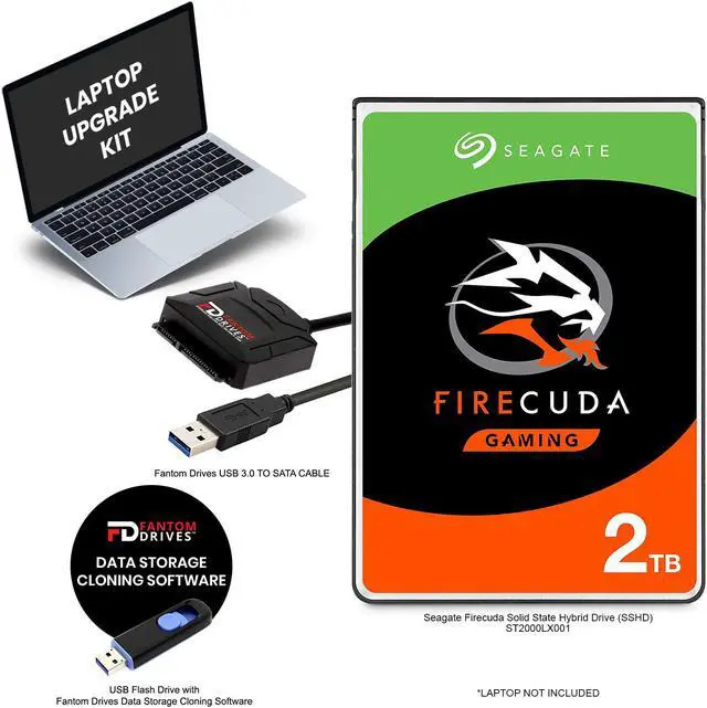Upgrade your existing laptop hard drive easily with Fantom Drives 2TB SSHD Upgrade Kit. The complete kit includes a 2TB Seagate FireCuda SATA 6.0G b/s 2.5" internal solid state hybrid drive, Fantom Drives USB 3.0 to SATA Cable Converter and Fantom Drives Data Storage Cloning Utility for Hard Drives and SSD software. Easily clone your original drive without having to reinstall operating system or drivers.
