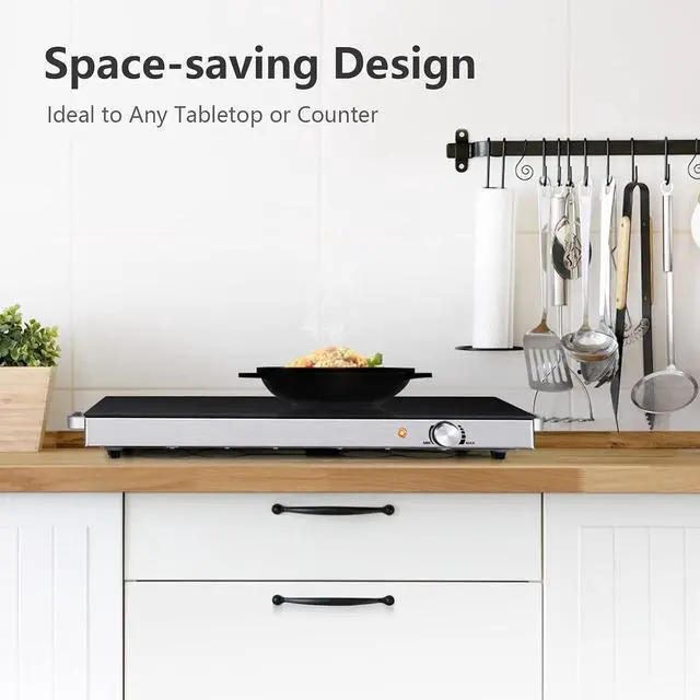 Our electric warming tray includes a large surface area that measures 22 x 14 inches. It can accommodate multiple dishes at the same time, and a temperature control knob makes using it super easy.