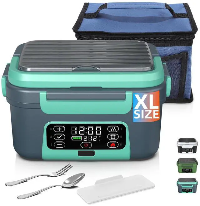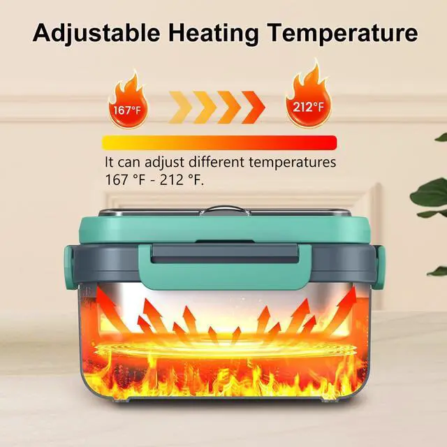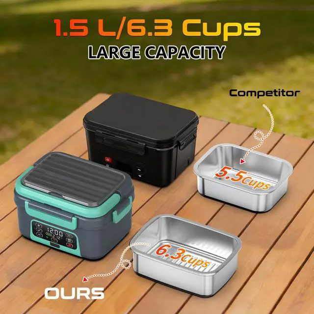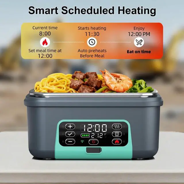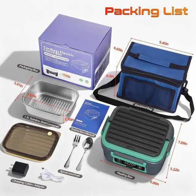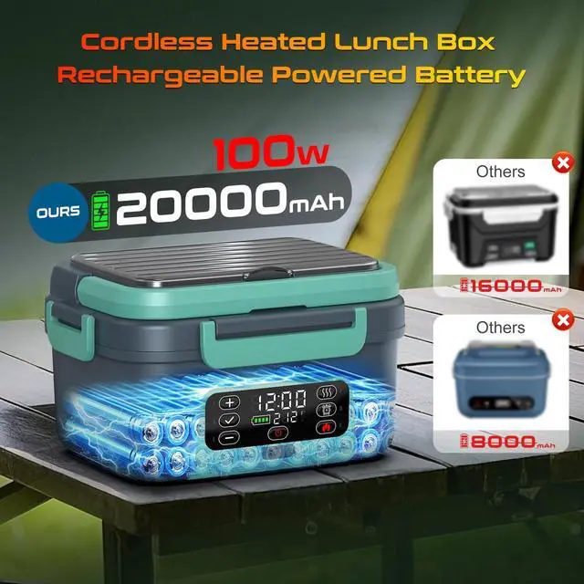 Innovative design. Charging lunch boxes with cables are extremely inconvenient for outdoor use. To bring convenience to people. Our team optimized and upgraded the product based on its shortcomings, and produced the second-generation wireless lunch box. This cordless heated lunch box designed for modern mobile lifestyles. Experience the ultimate convenience of hot meals on the go with our cordless, battery-powered self-heating lunch box. This advanced portable food warmer delivers effortless outlet-free heating. It's the ideal solution wherever microwaves are unavailable or impractical. Perfect for Use At the Office, Outdoor, In the Car, Traveling, Camping, The Classroom, Construction Sites. For Best Heating Results: 1. Breakthrough Innovation - Invention patent. In order to ensure even heating of food and avoid the problem of bottom heating and top cooling of food. We made technology of all-round 360°heating. 2. Using 100 watt technology can better achieve 360 ° uniform heating effect, rather than using 80 watts and 60 watts. Modern Intelligent Life: 3 Intelligent Heating Functions 1. Intelligent time setting allows you to set a timed heating function based on local meal times, which is more convenient for adults, men, women, and the elderly. You can eat at the appointed time without waiting. 2. Adjustable heating time is more convenient for people to set different heating times for different foods every day, better controlling the taste of food. Enjoy a delicious life. 3. Adjustable heating temperature is more convenient for people to set different heating temperatures for different foods every day, better controlling the ripeness of food. Maintain a better taste of food. Thoughtful Design for Everyday Use 1. Large XL 6.3cups Capacity: Features a XL capacity, Compared to traditional L and ML has a larger capacity, but remains compact and highly portable. Better accommodating adult meals. 2. Easy to Clean: Made of detachable designboth the inner container and lid are dishwasher-safe. 3. Leak-Proof Design: The cordless heated lunch box has a silicone seal on the lid, so you don't have to worry about liquid leakage. 4. Precise Temperature Management: Equipped with precise temperature control systems and a real-time temperature display. 5. Insulated bag: Placing the device in an insulated bag can help maintain heat and increase the temperature of food.