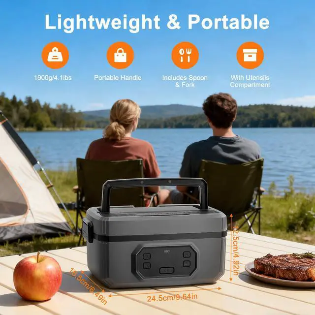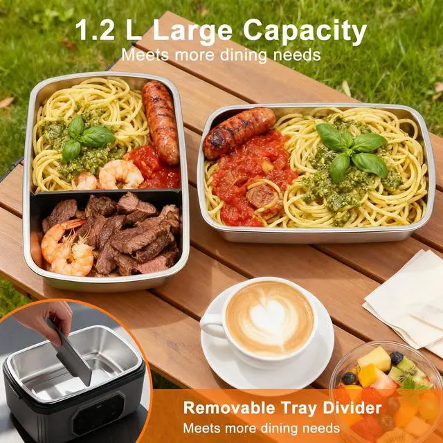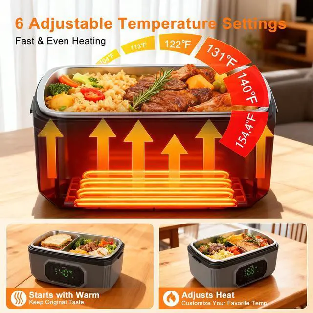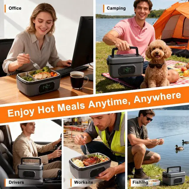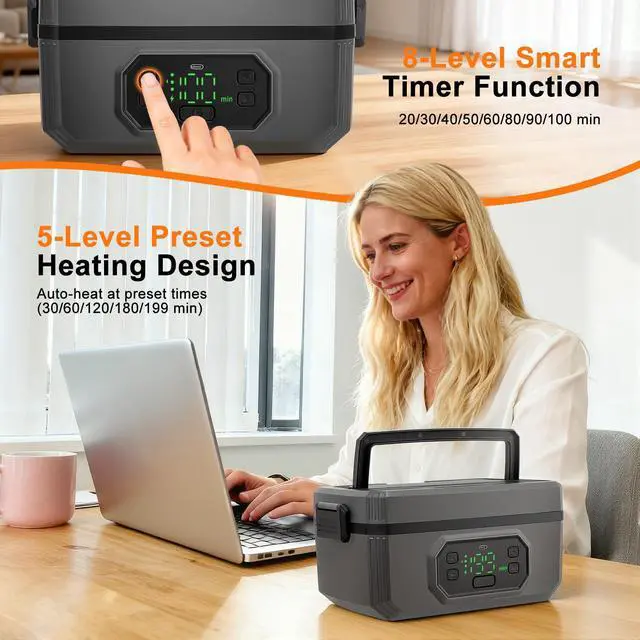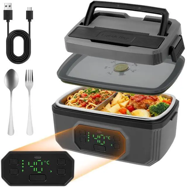 Smart Temperature Control & Heating Experience precision heating with our intelligent lunch box featuring 6 adjustable temperature settings (155 to 104) and 5 programmable timer options. Simply schedule your preferred heating duration (30/60/120/180/199 mins) before work the system automatically initiates heating and switches to keep-warm mode, maintaining optimal temperature for up to 100 minutes after heating completes. The 8-gear heating time selection ensures perfect results for all meal types. Unmatched Battery Performance Equipped with a massive 21,000mAh rechargeable battery that delivers: 6+ hours of continuous warming 20+ minutes rapid heating per cycle Dual-function as emergency power bank The integrated LED power display provides real-time battery monitoring, while USB-C fast charging keeps you powered throughout the workweek. Spacious 1.2L Meal Capacity Our ergonomic design offers generous 1.2L (4-cup) storage: Holds 3 full pasta servings Stores 12 dumplings + sides Accommodates multiple sandwiches The versatile space accommodates complete meals with proper portion separation using the included divider. True Cordless Freedom Engineered for professionals who need hot meals anywhere: Zero power outlets required Works in vehicles/construction sites/outdoors Silent waterless heating technology Leak-proof silicone sealed container Premium Convenience Features Dishwasher-safe removable container & utensils Hidden carry handle for portability BPA-free food-grade SUS304 stainless steel Anti-slip base & odor-free PP construction