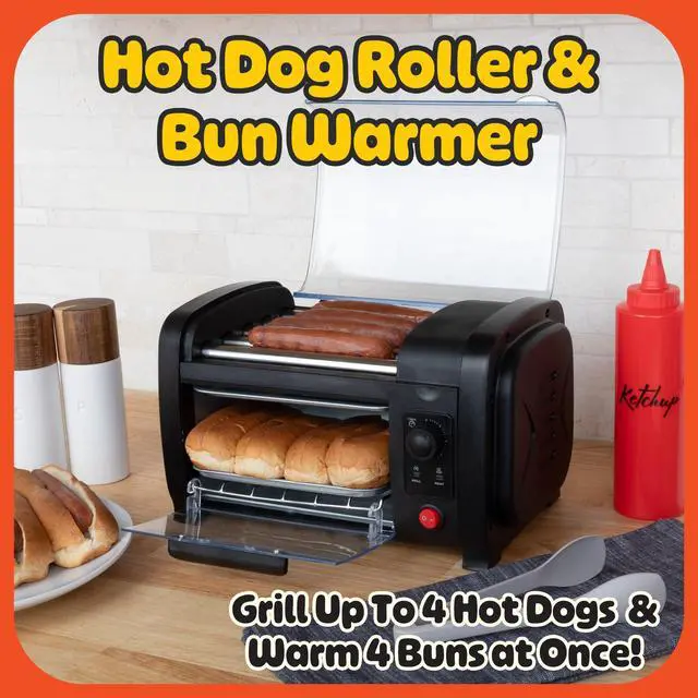 This hot dog warmer with bun warmer has 5 stainless-steel rollers on top and a mini toaster oven with a bake tray on the bottom so you can perfectly prepare up to 4 hot dogs and 4 buns all at once, perfect for everything from making an easy weeknight meal to quickly preparing party snacks at your next tailgate.
