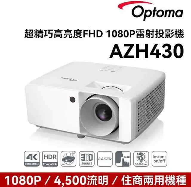 The AZH430 is Optoma's compact, convenient FHD 1080p DuraCore laser projector. Designed for maintenance-free continuous operation, it can be installed in almost any orientation and position due to its small size and light weight (34% smaller).