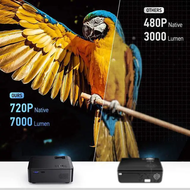 Upgraded High Brightness WIFI Mini Projector offers outstanding sharpness with native resolution 1280*720, with +60% brightness, 200" large screen and high sound quality, also enhanced the projection color contrast to 3000:1 to restore the true color
