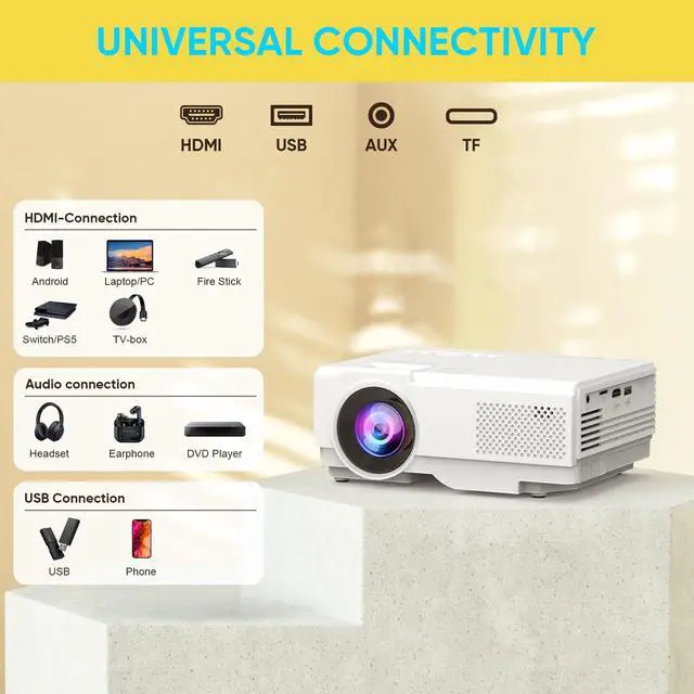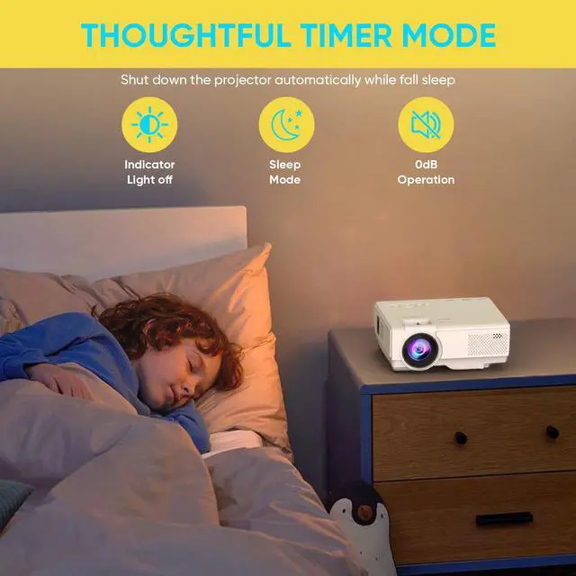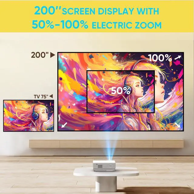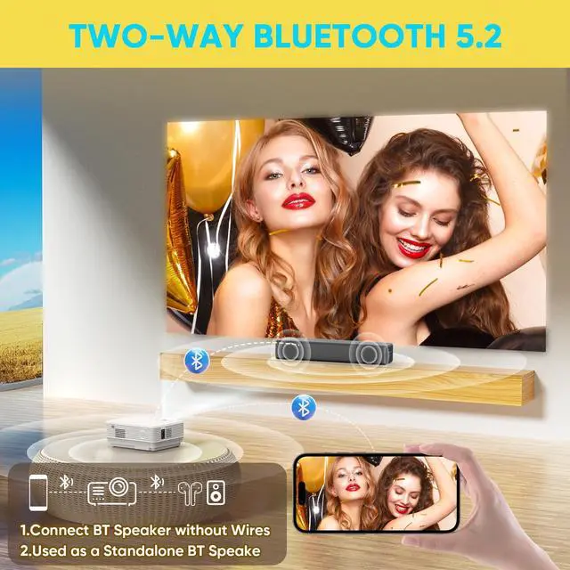 TWO-WAY BLUETOOTH & 50%-100% DIGITAL ZOOM: Wirelessly pair your Bluetooth speakers, headphones and soundbar anytime and anywhere to enrich your cinematic audio experience. This projector can also act as a Bluetooth speaker, connecting your phone and then enjoy music from the projector. Its digital zoom function saves you hassle from moving the projector back and forth by adjusting image size from 50%-100% at your fingertips.