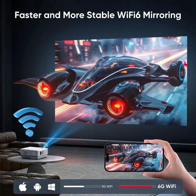 Next-Gen Wireless Connectivity Featuring cutting-edge WiFi 6 technology for faster speeds and ultra-stable connections. This portable projector enables instant smartphone screen mirroring (iOS/Android) with no lag - perfect for spontaneous movie nights or video gaming anywhere.