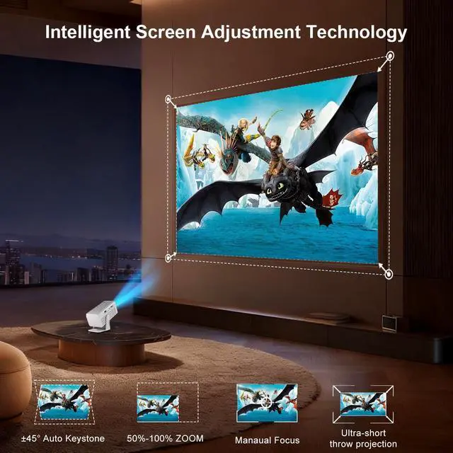 Gone are the days of manual adjustments. Our intelligent electric keystone correction automatically aligns the image within 3 seconds of setup. Place the projector on a table, shelf, or even angled surfaces the advanced sensors ensure your screen is always perfectly rectangular and focused.