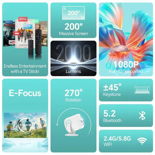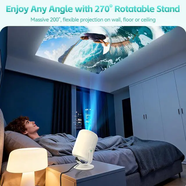 VF211WF Mini Projector Native 1080P Support 4K Portable Movie Projector WIFI 6 and Bluetooth 5.4, 270° Rotation, 40-200 Display, Eletric Focus and Keystone, Sound Base Speaker, Video Projector