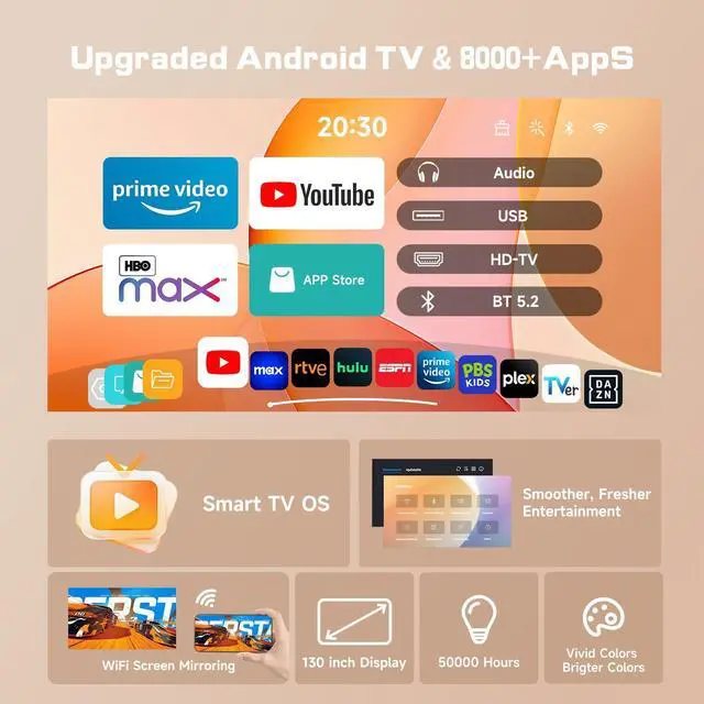 Vivid DisplayThis smart projector supports the playback of Full HD videos, offering clearer pictures and more vivid colors for an immersive home theater experience