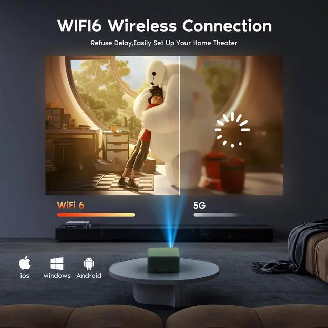 WiFi 6 ConnectivityThis mini projector with WiFi and Bluetooth integrates 5G WiFi and WiFi 6 technology for rapid and stable screen mirroring. Experience smooth and lag-free streaming of your favorite content directly onto the big screen.