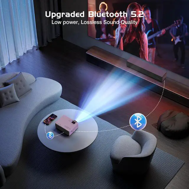 - Dual-Mode Bluetooth 5.2—Stream Audio Both Ways: Equipped with the latest Bluetooth module, this Bluetooth projector gives you complete audio freedom. Use it to wirelessly connect to external Bluetooth speakers or headphones for an immersive surround sound experience. Need a speaker? Simply switch to Bluetooth speaker mode and use the projector itself to play music from your phone or tablet. It’s the perfect 2-in-1 audio solution for indoor relaxation or outdoor gatherings.