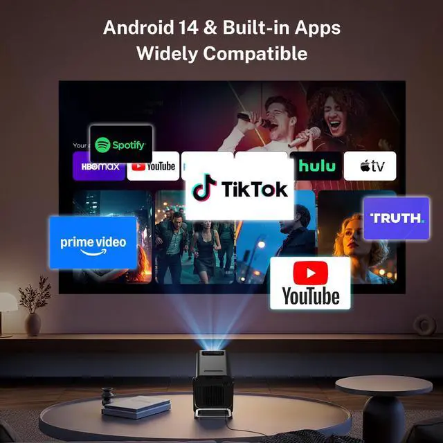 [Android 14 & Built-In 7000+ Apps] Transform any space into a smart entertainment hub. Powered by the advanced Android 14 OS (features built-in sleep timer), this projector for bedroom grants you direct access to over 7,000 Apps. Stream your favorite movies, sports, and shows seamlessly right out of the box without needing extra TV sticks or external devices