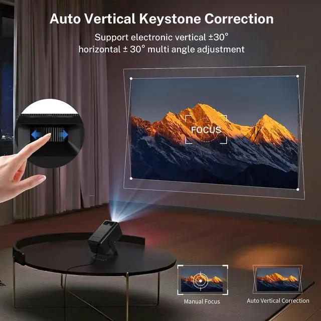 [270° Rotation & Auto Keystone] Free your hands and viewing angles. Unlike standard projectors with limited adjustment, our smart projector features a 270° rotating stand, allowing you to project seamlessly onto walls or ceilings. Combined with Auto Keystone Correction and Manual Focus, you get a perfectly aligned rectangular and clear image every time