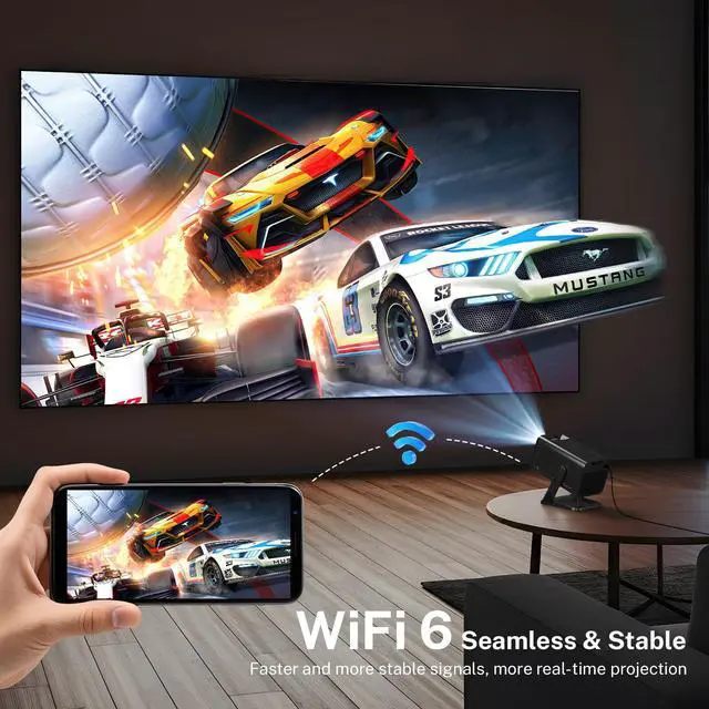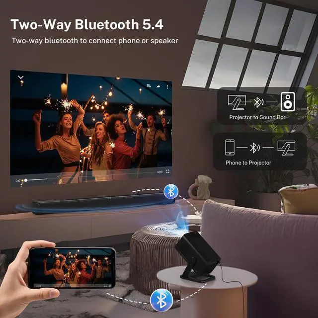 [Latest Wi-Fi 6 & Bluetooth 5.4] Experience lag-free streaming audio. Equipped with the newest Wi-Fi 6 technology, this projector with wifi and bluetooth ensures a stable, high-speed connection for mirroring smartphones or laptops. The upgraded Bluetooth 5.4 effortlessly syncs with your external speakers or headphones, while the built-in speaker also delivers excellent standalone sound