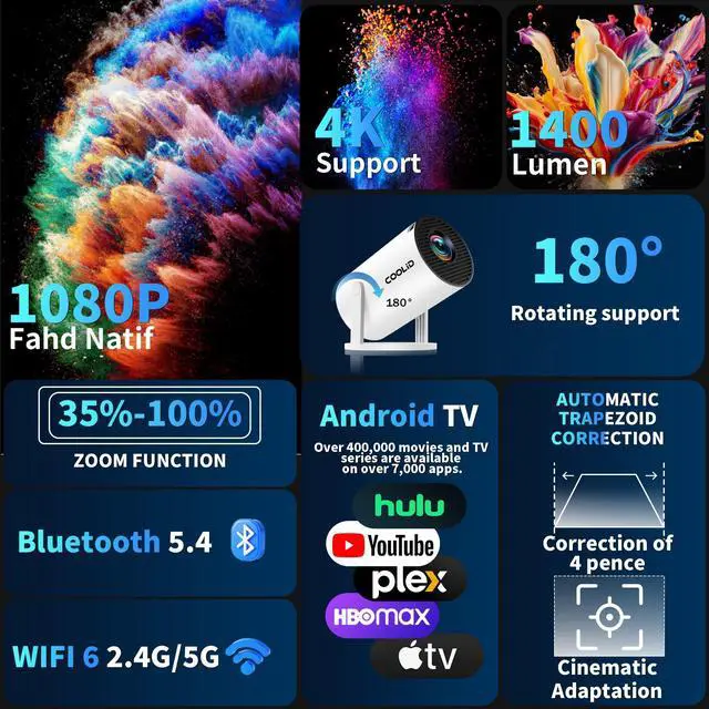 ![Main image of [Built-in Apps & 2026 Upgraded] Mini Projector Support 4K 1080P Auto Keystone 180° Rotatable with WiFi 6 and Bluetooth 5.4, Projector Portable Compatibile with HDMI/TV Stick/Memory Stick/Laptop-White](https://c1.neweggimages.com/productimage/nb640/C40TD2511260H96V95B.jpg)