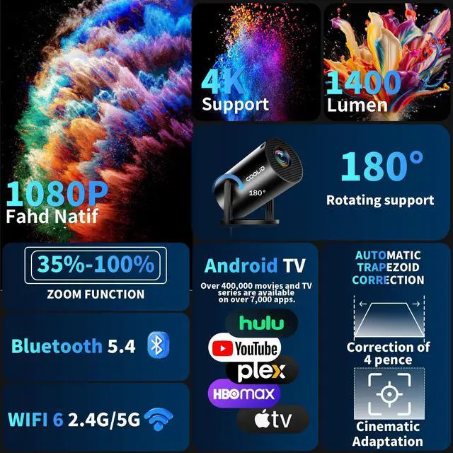 ![Main image of [Built-in Apps & 2026 Upgraded] Mini Projector Support 4K 1080P Auto Keystone 180° Rotatable with WiFi 6 and Bluetooth 5.4, Projector Portable Compatibile with HDMI/TV Stick/Memory Stick/Laptop-Black](https://c1.neweggimages.com/productimage/nb640/C5RHD2603090HVL2K2B.jpg)