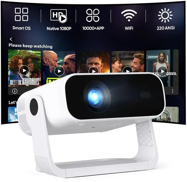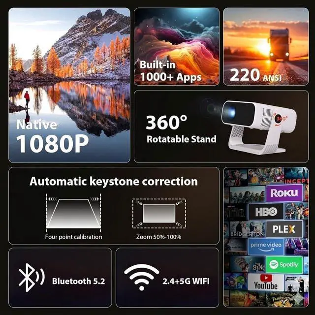 220ANSI Brightness, Native 1080P: Equipped with 220ANSI lumens, HDR10+ technology, native 1080P resolution, and this projector delivers exceptional image quality. HDR10+ significantly enhances contrast and color accuracy, making bright scenes more vivid and dark scenes deeper and more detailedevery detail is presented as rich and dynamic as intended. Enjoy sharp, clear 1080P visuals. Whether youre using it as a bedroom projector for cozy nights in or an outdoor projector for backyard gatherings, it brings immersive viewing experiences every time.