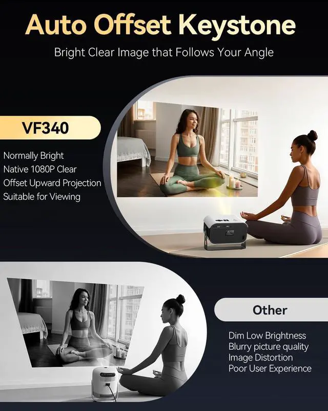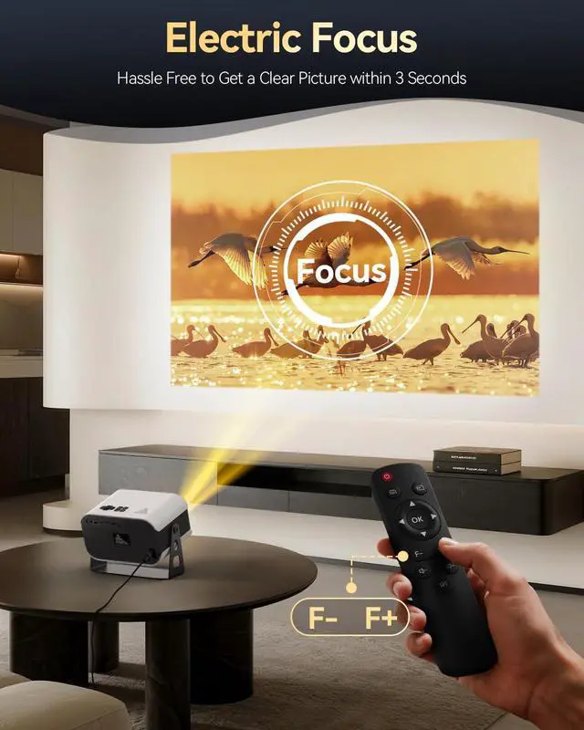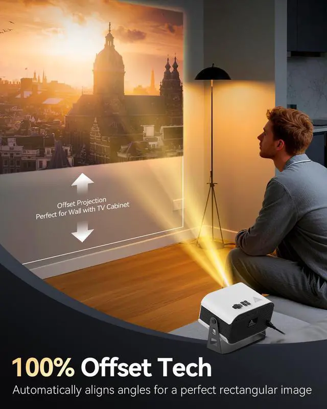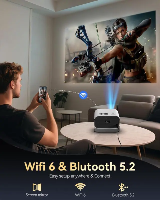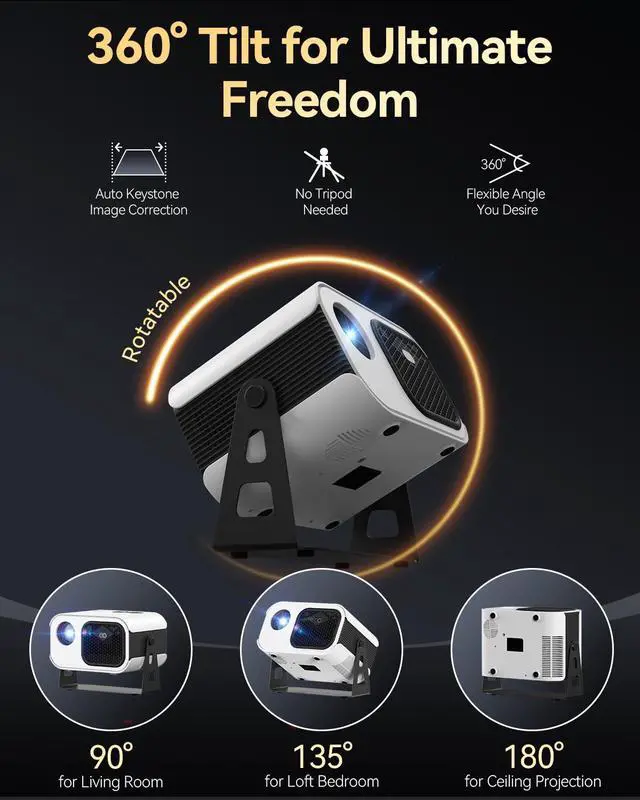 Product FeaturesProjection Performance: Native 1080P, Built in 5W HIFI Stereo Speaker support multiple Audio, Throw Ratio: 1.33:1, Projects 47200 inches from 1.54.8 meters away Connectivity: Wi-Fi 6 & Bluetooth 5.2, TYPE-C, HDMI, USB, TF (microSD) Easy Setup: Electronic Focus & Keystone Correction, 100% Offset Technology, 360° Rotatable Stand, Mounting Flexibility: a 6mm mounting hole at bottom supports tripod, ceiling, wall, or tabletop installation Suitable for Home cinema use, like bedrooms, home theaters, living rooms, outdoors, patios, camping, and more