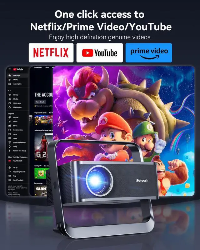 Take your movies anywhere with this 4K projector. JAYSUING Portable Smart Projector All-in-One Streaming.The 4k projector with wifi and bluetooth built in over 10,000 apps and 800+ free live channels, including Netflix, YouTube, Prime Video,Disney+ and Hulu. Native 1080P Projector 4K & HDR10+ Supported and AI image optimization ensures sharp, detailed, and vibrant visuals. Colors are richer, and contrast is boosted by 25% for lifelike images. Just press the mic button and use Google Assistant voice control to play shows, adjust volume, or ask for the weather. Search across apps, launch YouTube or Prime Video, and cast content from iOS/Android smartphonesperfect for both outdoor projector for camping travel and home theater. AI Auto Focus & Keystone Correction Sharp in Seconds This mini projector delivers instant Auto Focus and 4D/4P Keystone Correction in 3 seconds, even when moved or tilted. With screen sizes from 40200 inches and 50100% zoom, its great for bedroom, meeting, or gaming projector. Hi-Fi Speakers & WiFi Projector Smooth Connectivity Equipped with 2x10W Hi-Fi speakers for immersive surround sound and Bluetooth 5.2 for external devices. The video projector supports up to 9.6Gbps speeds, ensuring lag-free streaming, gaming, and screen mirroring. HDMI input connects consoles like PS5, Xbox, and Nintendo Switch seamlessly. Stop Compromising on Entertainment Get Your JAYSUING Smart Projector 4K Today!