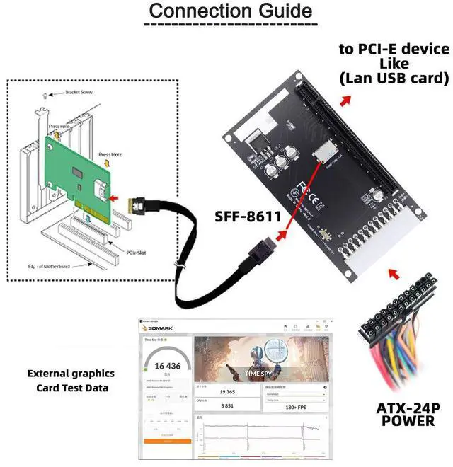 • The converter support all standard PCI-E 16x 8x 4x card, like USB,LAN,1394,Audio,Graphics Card.