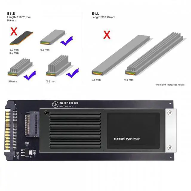 This converter enables the connection of a GEN-Z SSD in E1.S. Fit for 9.5mm and 15mm and 25mm thickness SSD with heat sink.ike PM9A3 PM9D3 P5801X)