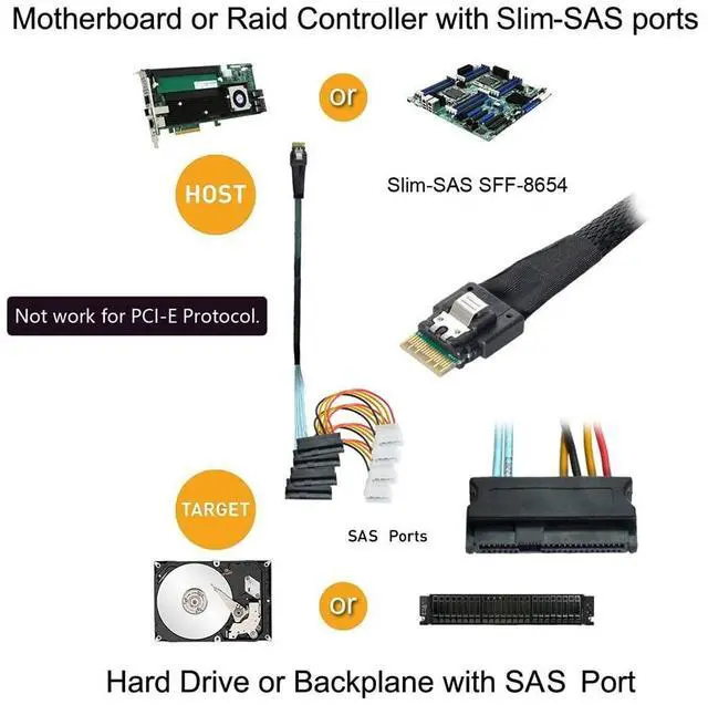 This SAS cable can be used to connect internal devices, e.g. a hard disk with SAS 29pin connector to a controller with Slim SAS SFF-8654 4i connector.