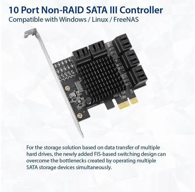 The SY-PEX40167 adds 10 SATA 6G ports through a PCIe 3.0 x1 card to your PC System. It's an ideal solution for surveillance users to install up to 10 SATA drives and/or ODD drives in one low profile PCIe card without driver installation required.
