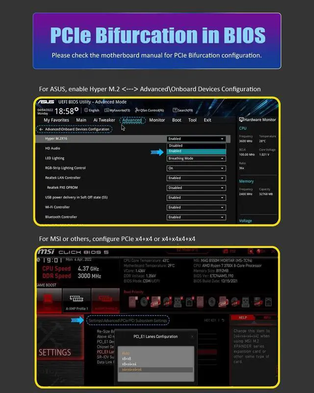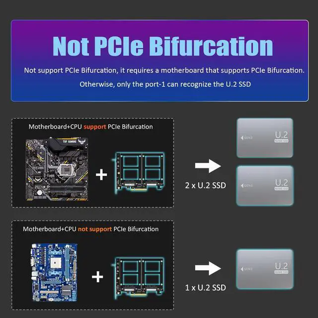 Important: Because this adapter does not support PCIe Bifurcation, it requires a motherboard that supports PCIe Bifurcation. Otherwise, only the Port-1 port can recognize the U.2 SSD. Before purchasing, please check the PCIe expansion slot part of the motherboard manual on the motherboard manufacturer's website, or consult us directly