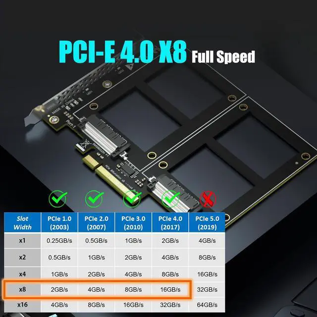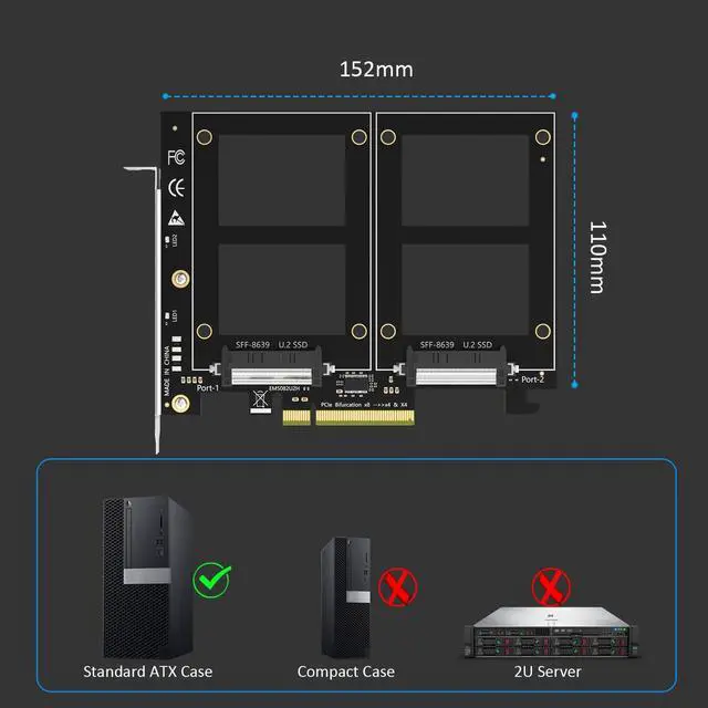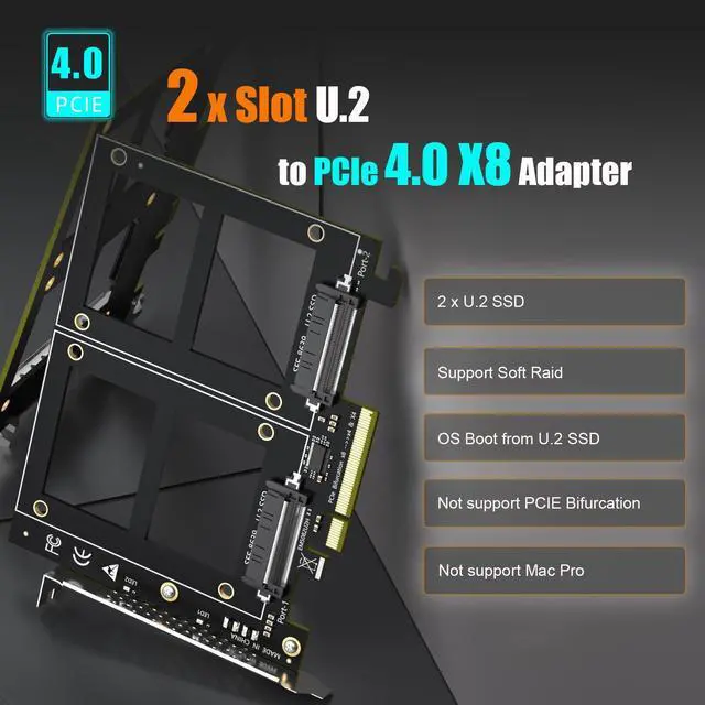Dual U.2 to PCIe 4.0 X8 Adapter: By installing 2 x U.2 SSDs on this PCIe 4.0 X8 adapter, your computer will be able to access 2 x U.2 SSDs at the same time